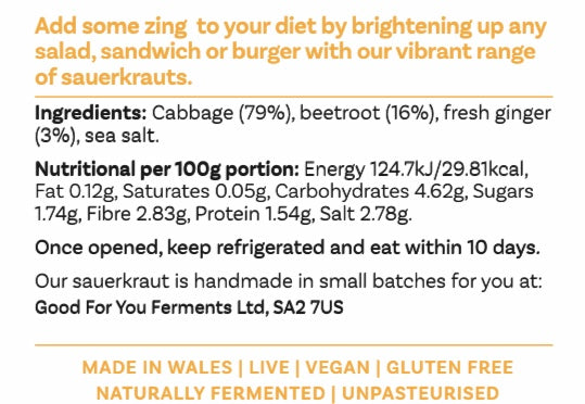 This award winning, naturally fermented, unpasteurised beetroot sauerkraut is a great choice for those looking for the best sauerkraut to buy in the UK. It has an earthy but zingy flavour as it’s made with cabbage, fresh beetroot and fresh ginger. The rich purple colour of this sauerkraut helps to brighten up any dish as a side accompaniment. This flavour won a 1 star Great Taste Award in 2021